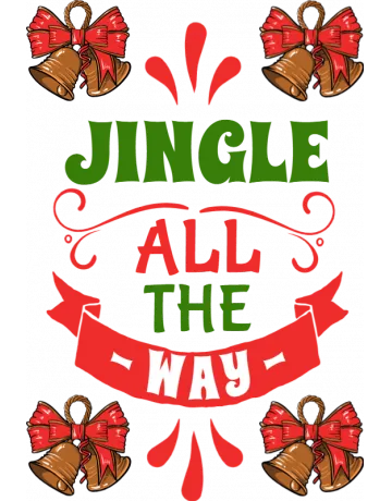 A festive holiday design featuring the phrase 'Jingle All The Way' in green and red text, surrounded by bells and a red banner.