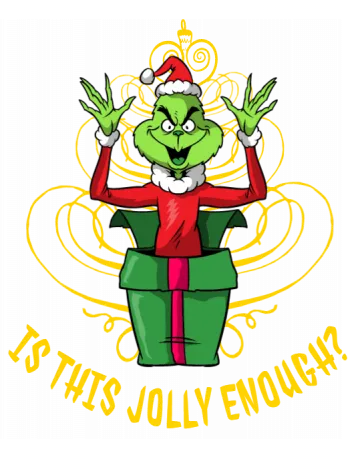 A cartoon illustration of the Grinch with the words 'IS THIS JOLLY ENOUGH?'.