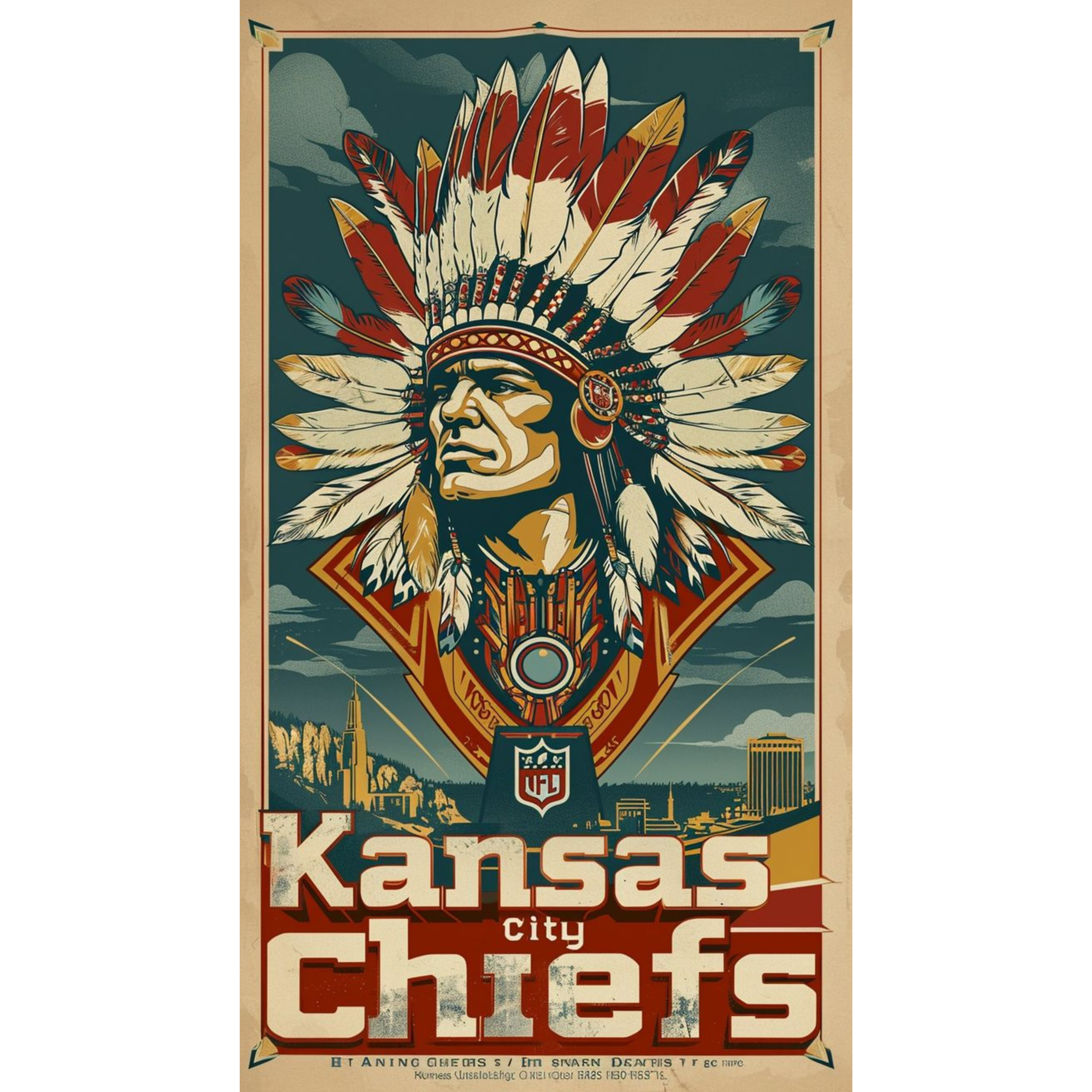 A poster with an illustration of a Native American man wearing a headdress, with a city skyline in the background.