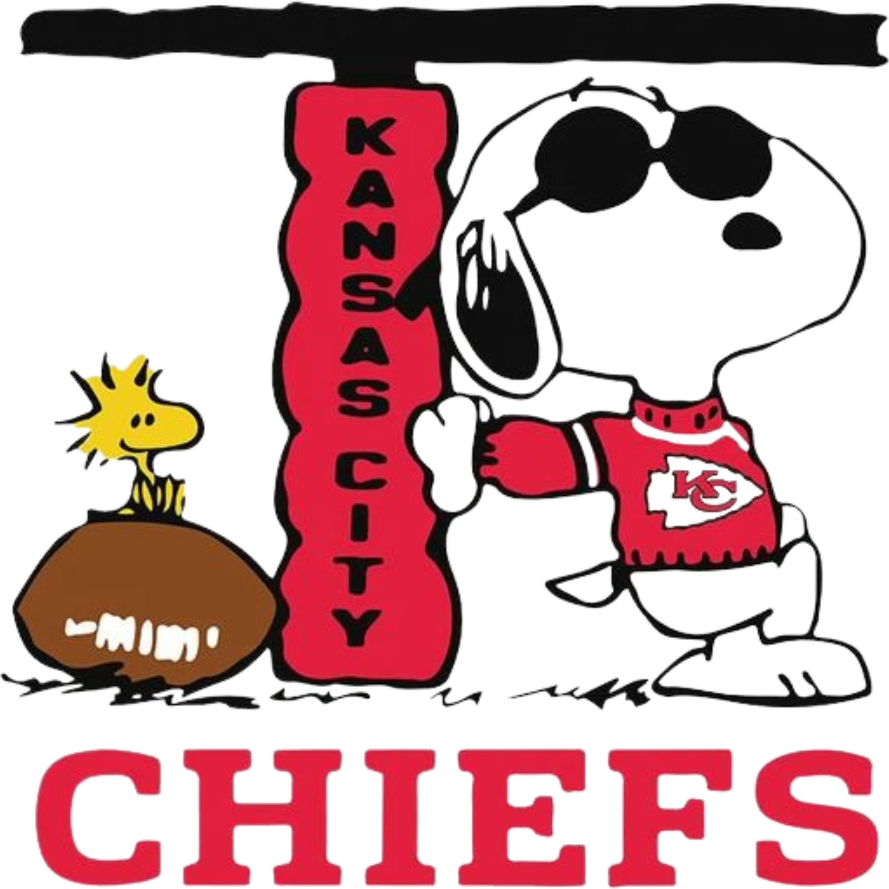 A t-shirt design featuring the Kansas City Chiefs football team mascot and the Peanuts character Woodstock.