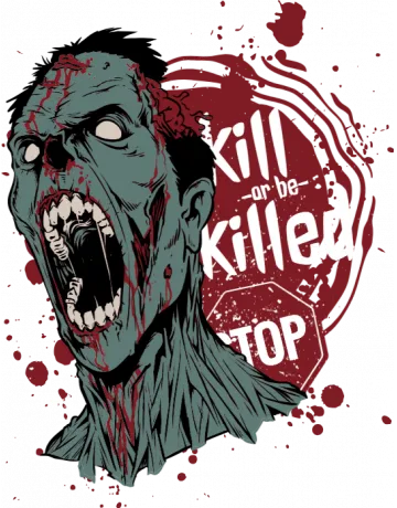 A zombie's head with a bloody mouth and the words 'Kill or be killed' in white