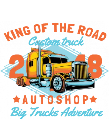 A t-shirt design featuring a yellow truck with a large grill and a trailer, accompanied by the text 'King of the Road' and 'Custom Truck' above it, and 'Auto Shop' and 'Big Trucks Adventure' below it.