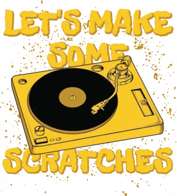 A yellow turntable with the words 'Let's make some scratches' in yellow, set against a black background.