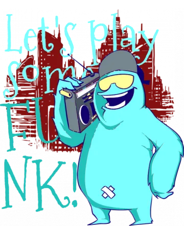 A cartoon character holding a boombox saying 'Let's play some funk!'