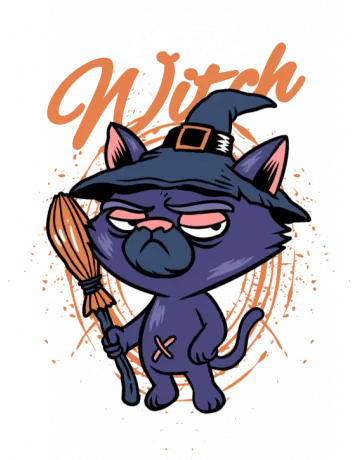 A cartoon cat wearing a witch hat and holding a broom, with the phrase 'Life's a Witch' above it.