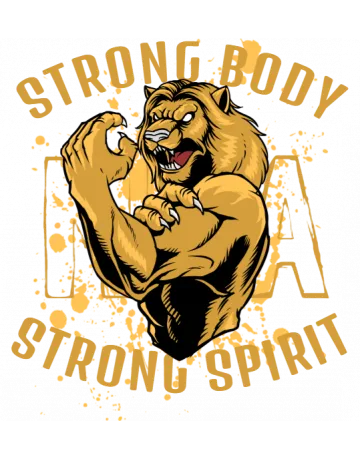 A cartoon tiger with its paw raised, surrounded by the words 'STRONG BODY STRONG SPIRIT' in a bold, yellow font.