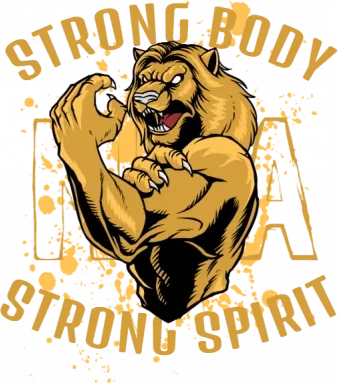 A cartoon lion with its mouth open, flexing its right arm, surrounded by the text 'STRONG BODY STRONG SPIRIT' in a bold, yellow font.