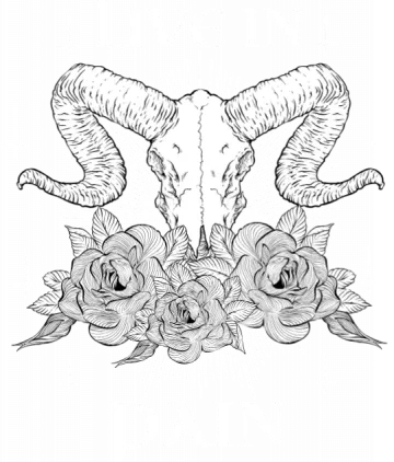 A skull with ram horns and roses, surrounded by the text 'Live in Pain'.