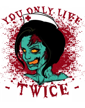 A zombie nurse with a hat and the text 'You Only Live Twice' in a blood splatter design.