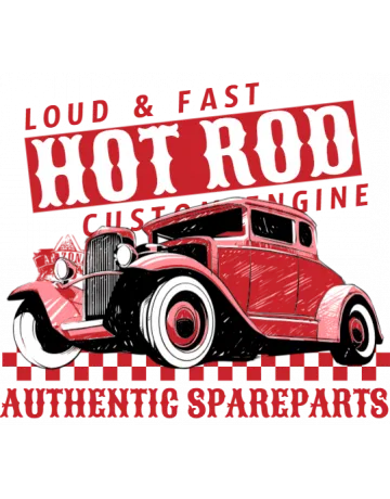 A vintage car with the words "Loud & Fast Hot Rod" and "Authentic Spare Parts" in a retro style.