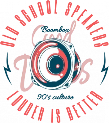 A graphic design featuring a boombox with the text 'Old School Speakers Louder is Better' in a retro style.