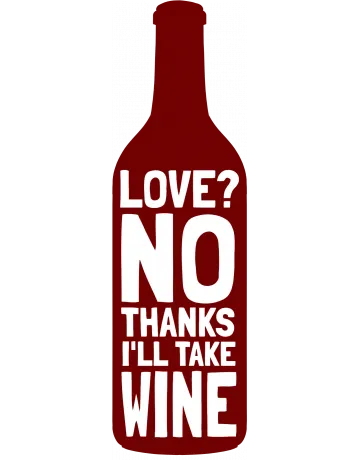 A wine bottle with the phrase 'Love? No thanks, I'll take wine' in a bold, white font.