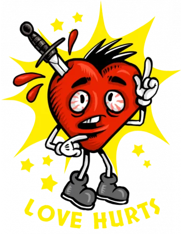 A cartoon heart with a knife through it and the words 'Love Hurts' written below it.