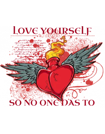 A heart with wings and a flame on top with the text 'Love Yourself So No One Has To'