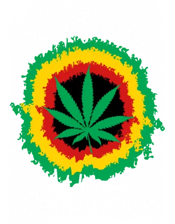 A marijuana leaf in the center of a circular design with a Rastafarian color scheme.