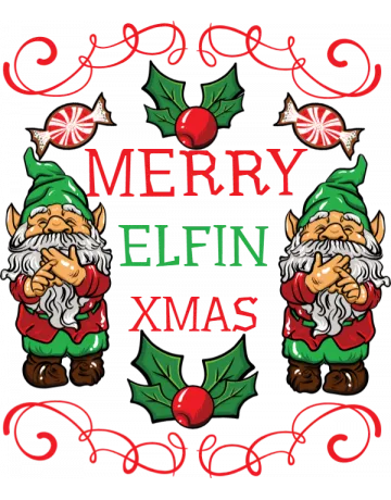 A cartoon gnome with a white beard and green hat, surrounded by holly and the words 'MERRY ELFIN XMAS' in red and green.