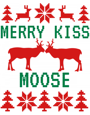 A festive holiday design featuring a moose and the phrase 'Merry Kiss Moose' in red and green pixelated text, surrounded by red Christmas trees and snowflakes on a black background.