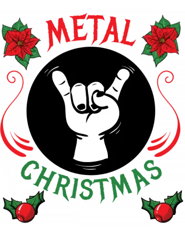 A festive holiday design with a metal theme, featuring a white hand sign and red and green accents.
