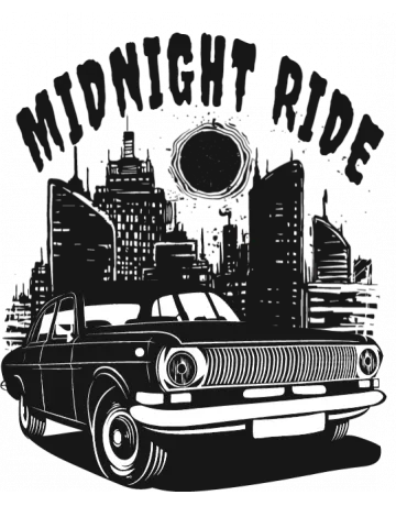 A car in front of a city skyline with the words 'Midnight Ride' above it.