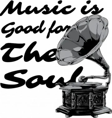 A vintage-style gramophone with a large horn and a record on the turntable, set against a solid black background.