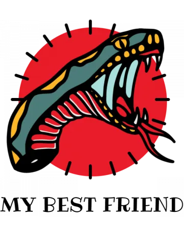 A colorful illustration of a snake's head with a red tongue and yellow eyes.