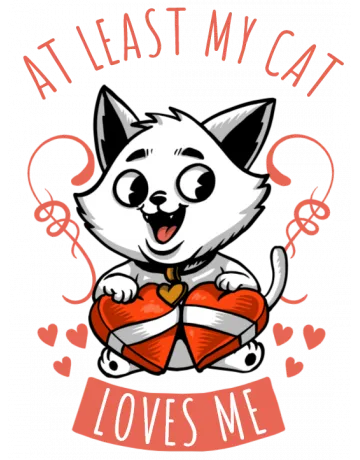 A cartoon cat holding a heart with 'At Least My Cat Loves Me' written above it.
