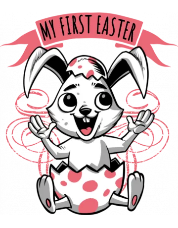 A cartoon rabbit with a banner that says 'My First Easter' in a playful font.