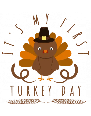 A cartoon turkey wearing a pilgrim hat with the words 'It's my first Turkey Day' written around it.