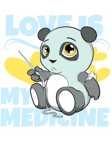 A cartoon panda with the words 'Love is my medicine' in large letters behind it.