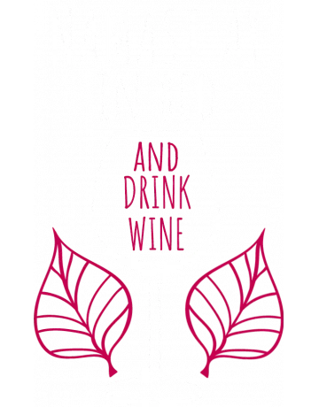 A wine glass with the words 'Namast'ay in bed and drink wine' in white and pink text, with pink leaves on a black background.