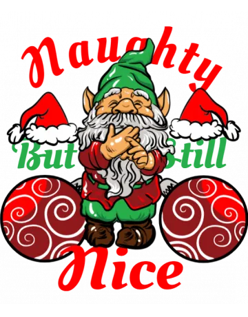 A cartoon elf with a beard and pointy hat, surrounded by the words 'Naughty' and 'Nice' in red and green, respectively.