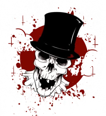 A skull wearing a top hat with the phrase 'NEVER TRUST THE LIVING' in a circle around it.