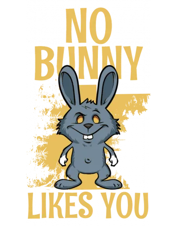 A cartoon rabbit with the words 'NO BUNNY LIKES YOU' in yellow text.