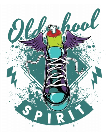 A stylized illustration of a shoe with wings and the words 'Old School Spirit' in a retro style.