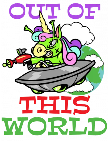 A cartoon unicorn riding a UFO with the words 'OUT OF THIS WORLD' in bold letters.
