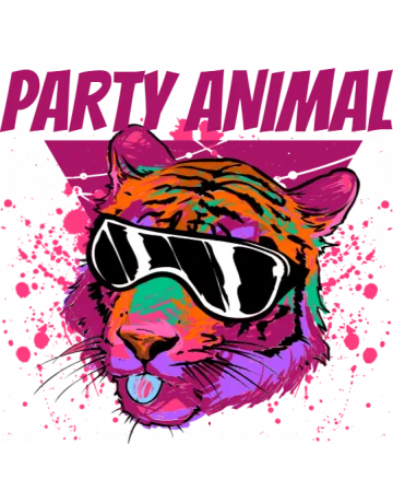 A colorful cat wearing sunglasses with the words 'PARTY ANIMAL' above it.