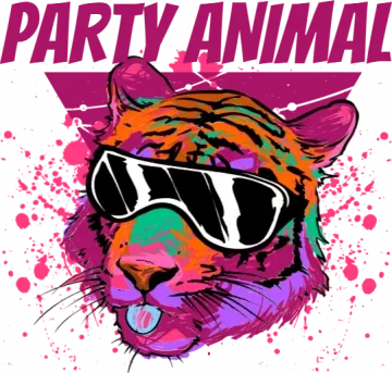 A cartoon tiger wearing sunglasses with the words 'Party Animal' above it.