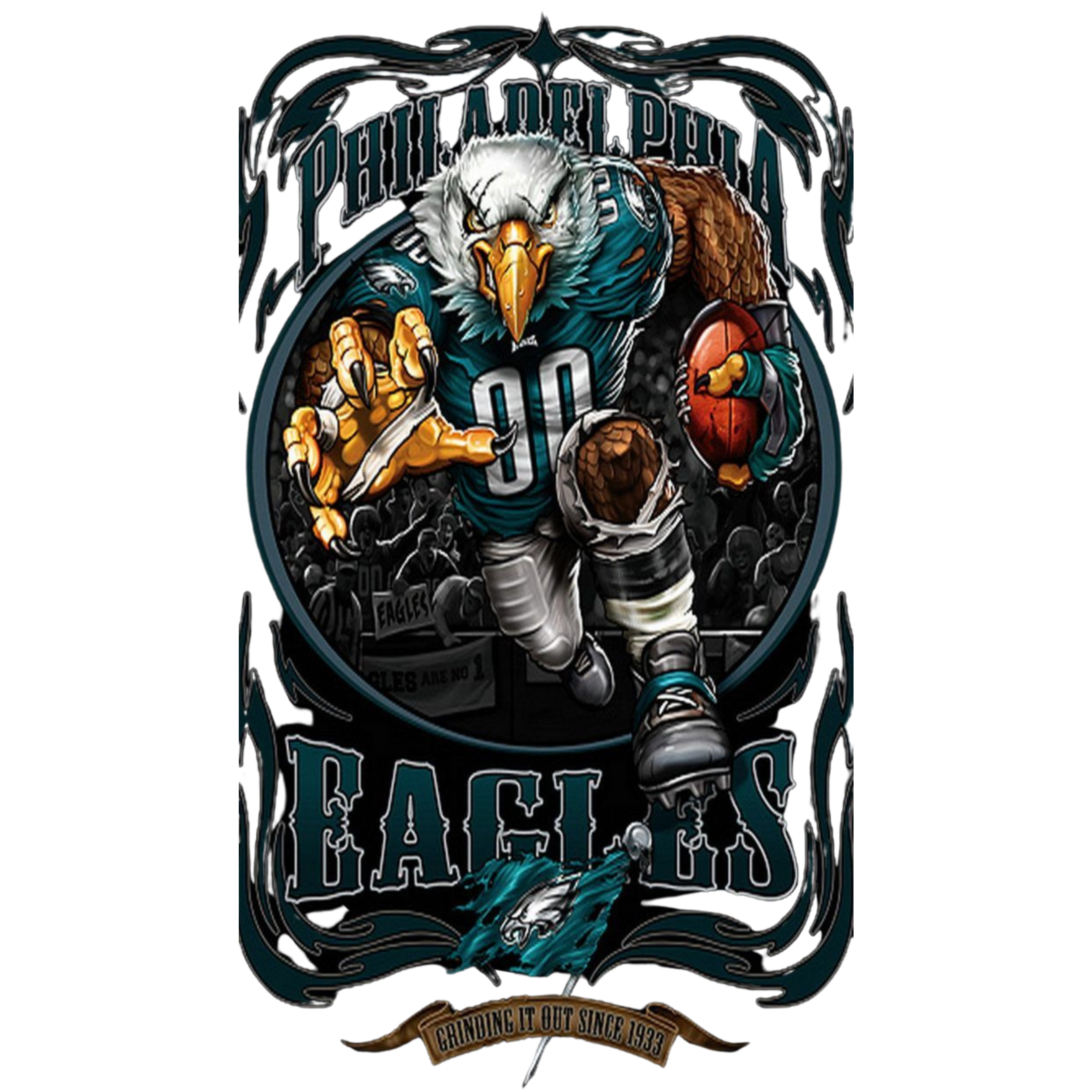 A Philadelphia Eagles football player in action, with a prominent eagle logo and the team name in stylized font.