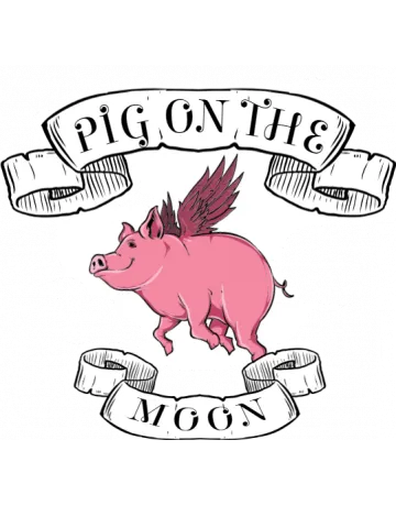 A pink flying pig on a white circle with a banner that says 'Pig on the Moon'.