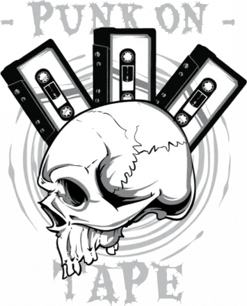 A skull with a tape cassette emerging from its eye socket, surrounded by the words 'Punk on Tape' in a bold, distressed font.