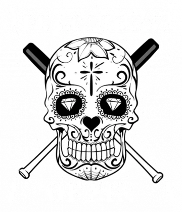 A skull with a cross and diamond eyes, surrounded by decorative swirls and filigree, with a heart-shaped nose and a mouth with teeth, set against a black background with a distressed texture.