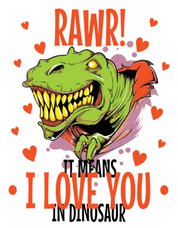 A cartoon dinosaur with hearts and text saying 'RAWR I LOVE YOU'