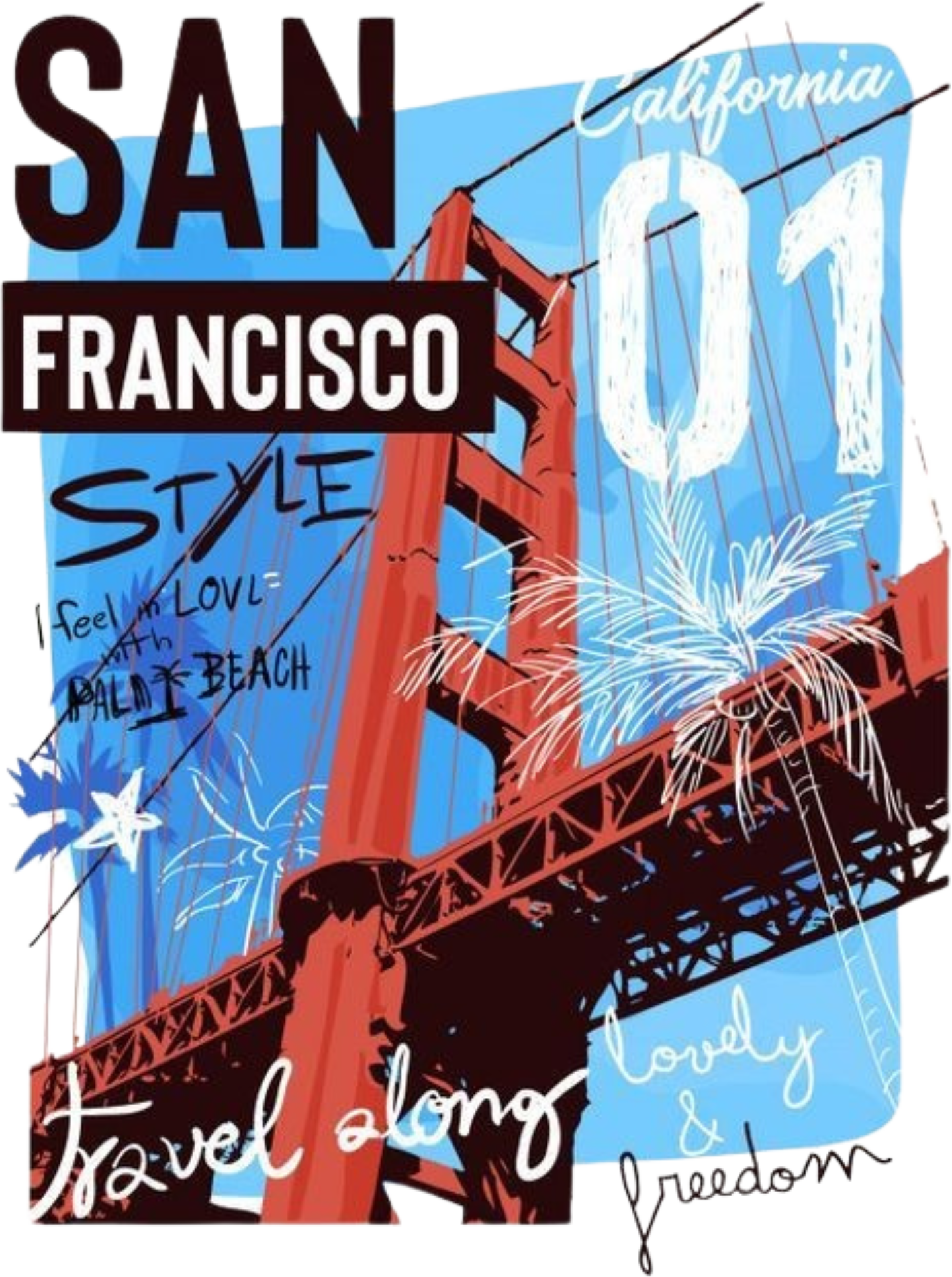 A t-shirt design featuring the Golden Gate Bridge in San Francisco with palm trees and a blue sky.