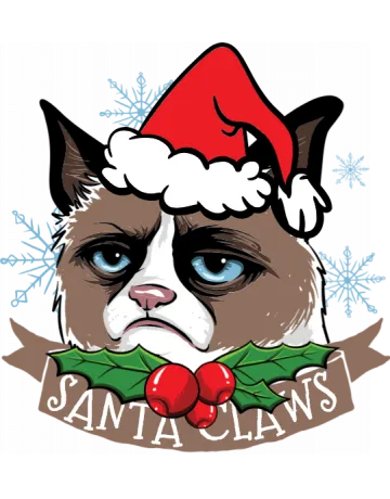 A cartoon cat's face with a Santa hat and holly, featuring the words 'Santa Claws' on a banner.