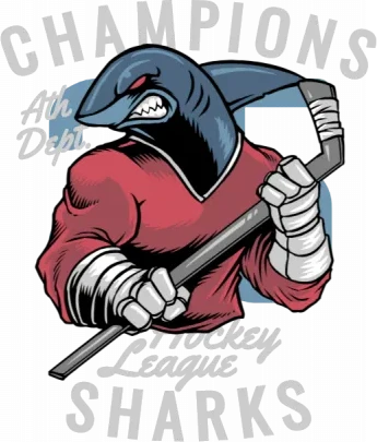 A cartoon shark wearing a hockey jersey and holding a hockey stick.