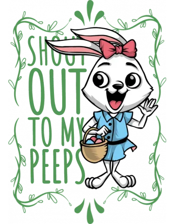 A cartoon rabbit with a pink bow and a basket of eggs saying 'Shoot out to my peeps'.