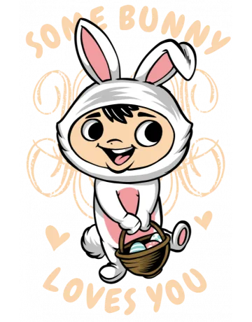 A cartoon bunny character with a basket of eggs and the phrase 'Some Bunny Loves You' in a playful, cursive font.