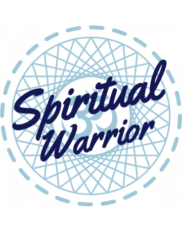 A circular design with a web-like pattern and the words 'Spiritual Warrior' in the center.
