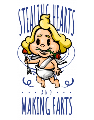 A cartoon cherub with blonde hair holding a rose and wearing a white cloth, accompanied by the text 'Stealing Hearts and Making Farts' in blue