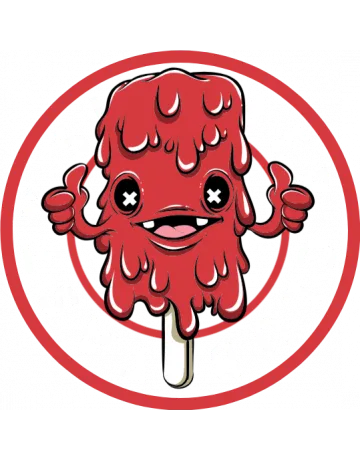 A cartoon-style melting red blob with a smile and arms, surrounded by a red circle with white text.